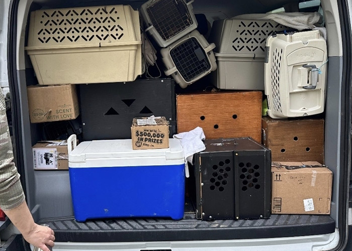 Once up top, our team of runners, the bikers, Oliver, and Ben W. carried critters to the van along the portions of Mill Pond Road that could not be traversed by the van. Jess was responsible for the animal carrier “Tetris game” of getting all 50-some animals into the van with ambassadors and rehab patients separated, prey and predator species separated, and all carriers having some level of ventilation and secure anchoring. Quite a feat.