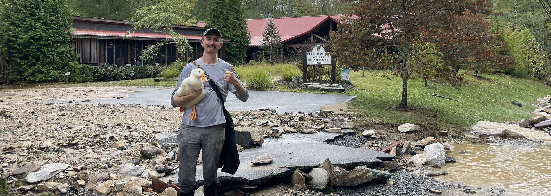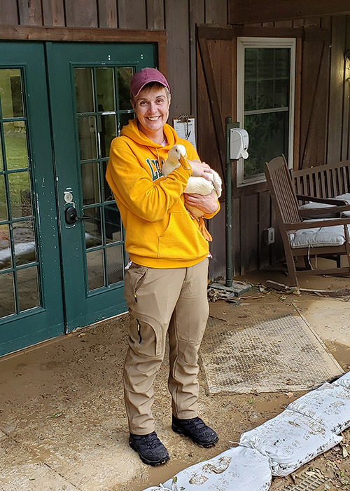 That next day we awoke with the sun, downed some coffee, and set out in a borrowed Lees-McRae van—Jess, Oliver, Nat, and myself, along with Mike Hannah, another Theatre Arts faculty member from Lees-McRae that lived just up the road from us. We hiked in the same way I had the day before with the students. Upon arrival, we fed and watered all the animals again with now dwindling and soon-to-spoil food supplies. The select few ready-for-release animals were caught up and placed in carriers for the hike. Some Virginia opossums were released on site up in the woods, but the juvenile Eastern cottontails, a great blue heron, and our friend Fred had to be hiked out. Nat, a self-described ”avid waterfowl fan,” having never touched one, was tasked with carrying Fred. Again, in the midst of this terrible disaster, here was another individual stepping up with positivity and perseverance to help. This certainly made her day, if not year. Fred was returned to his adopted flock at another pond adjacent to Mill Pond and the other animals released in respective ideal habitats.