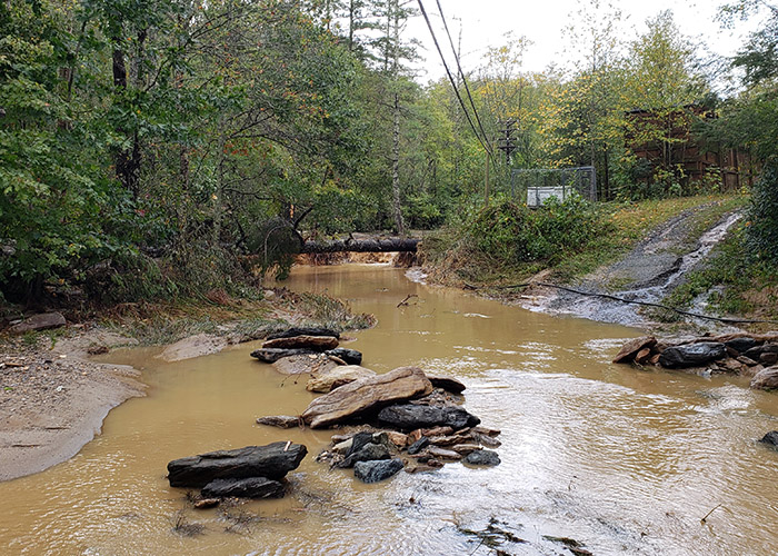 We hiked up Mill Pond Road to see if an easier exit could be found from this direction, and we were indeed able to rock hop, dodging powerlines and climbing over multiple downed trees to get back on Hemlock Trail. Above are the view of what had been Mill Pond Road below the level of the dam and the entrance to Hemlock Trail. That afternoon and night, communications were established with Kelli Johnson, one of the MWRC wildlife rehabilitators, via a landline phone that for whatever reason happened to still work in Bowman, the science building on main campus. She had spoken directly with or heard indirectly from other sources that the other center staff were safe but unable to get into Banner Elk proper due to major road washouts or blockages. The fate of MWRC and its housed critters was shared in return and a plan for the following day discussed.